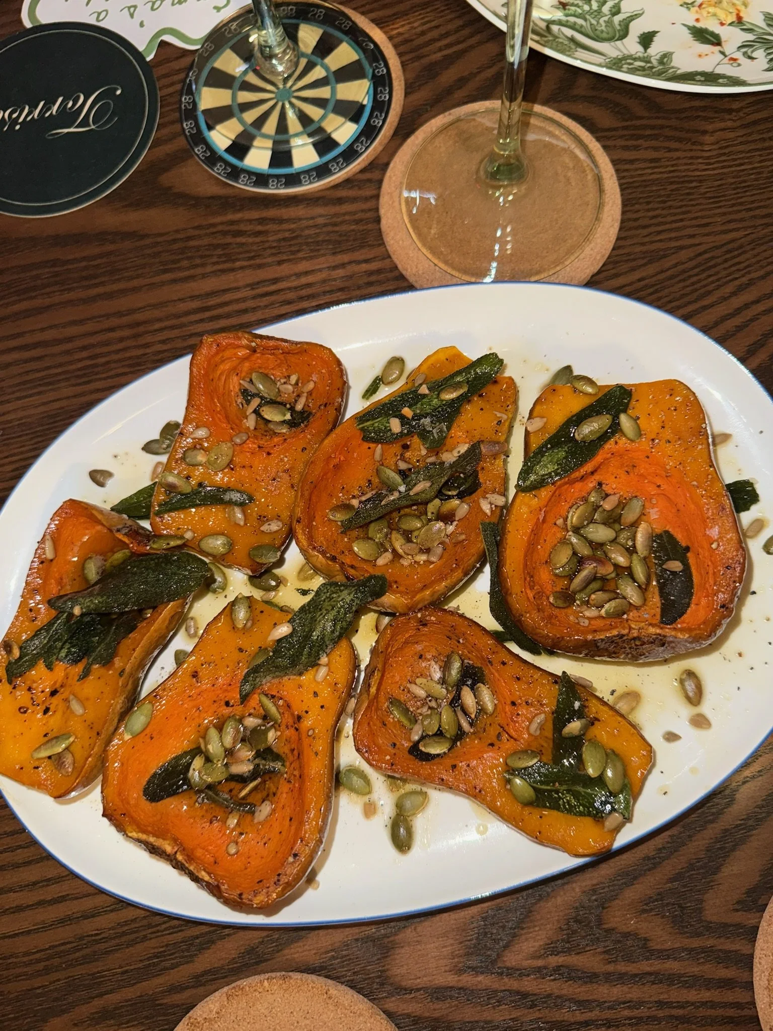 Roasted honeynut squash drizzled with brown butter and topped with fried sage and pumpkin seeds