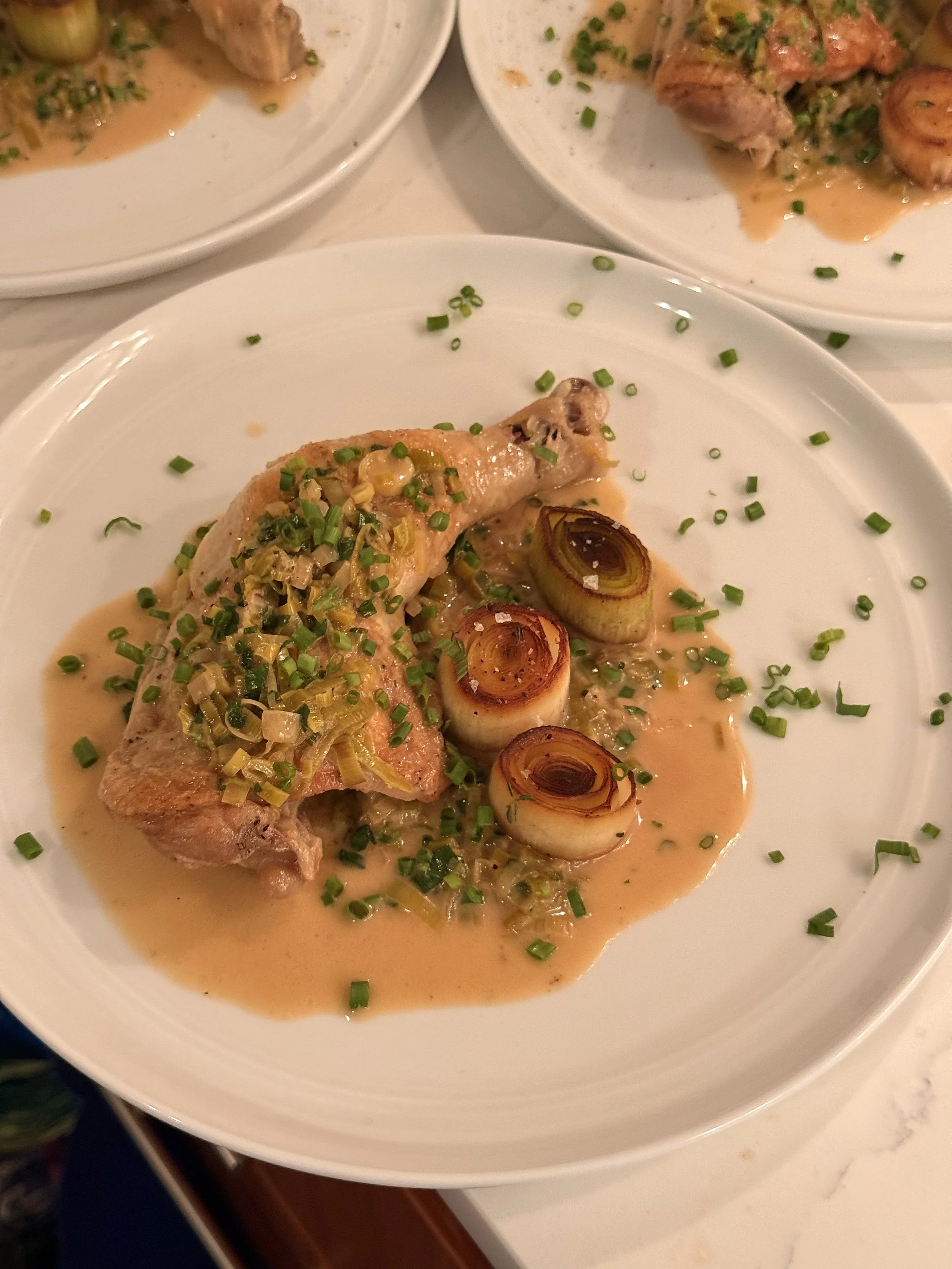 Braised chicken legs with juicy apricots and seared onions in “I would drink this stuff” ginger white wine sauce